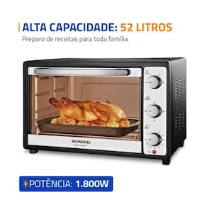 O Forno Elétrico Mondial Grand Family II oferece mais espaço e praticidade para suas receitas. Com 52 litros de capacidade, ele permite preparar desde pequenas porções até refeições completas para a família com tranquilidade. Seus 1800W de potência aquecem, assam, gratinam e grelham os alimentos com eficiência, facilitando seu dia a dia na cozinha.