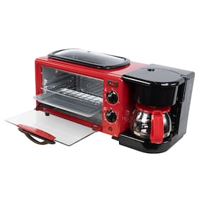 Forno elétrico 3 em 1 com cafeteira e grill. Capacidade do forno de 9 litros. Cafeteira com jarra de 550ml. Timer de 30 minutos com desligamento automático. Temperatura máxima de 230°C. Grill antiaderente com tampa de vidro. Inclui grade interna deslizante e bandeja assadeira.Forno autolimpante