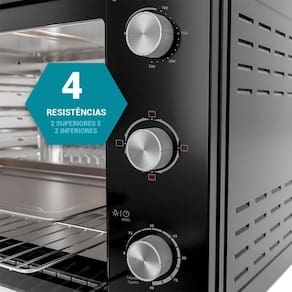 Forno elétrico de bancada com 4 resistências (2 superior e 2 inferior), 4 funções (Somente resistência inferior, somente resistência superior, ambas acionadas), temperatura ajustável de 100°C a 250°C, timer de 90 minutos com desligamento automático, grelha em aço cromado com 5 níveis de ajuste de altura, bandeja coletora, revestimento interno esmaltado e porta de vidro.Timer