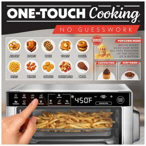 O painel digital com controle por toque oferece 12 funções pré-programadas: Air Fry, Bake, Roast, Toast, Bagel, Fries, Wings, Snacks, Broil, Dehydrate, Popcorn e Keep Warm, automatizando tempo e temperatura de acordo com a aplicação selecionada. O modo de convecção pode ser ativado para favorecer distribuição mais homogênea de calor, reduzindo o tempo de cocção e melhorando a uniformidade de resultados. As temperaturas podem ser configuradas até cerca de 204 °C, atendendo desde desidratação de alimentos a assados em alta temperatura.