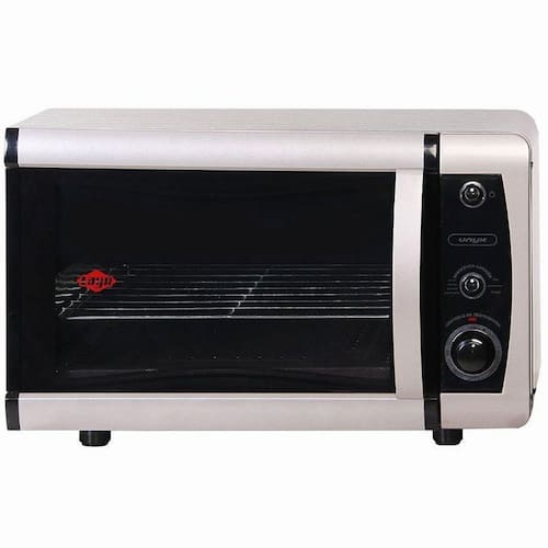 Forno elétrico com termostato ajustável de 50°C a 300°C, duas resistências blindadas (superior 750W, inferior 1000W), tecla multifunção, isolamento térmico, porta de vidro duplo com perfil de alumínio anodizado, lâmpada interna, uma prateleira removível com três posições, bandeja de proteção para a resistência inferior.Forno autolimpante