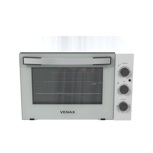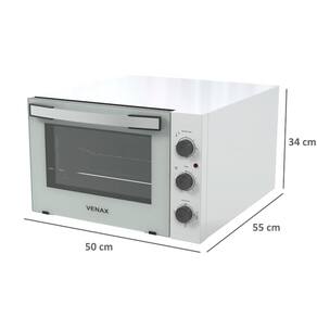 Tipo: Forno de bancada Marca: Venax Luz no forno: Sim (lâmpada não acompanha o produto) Prateleira do forno: 1 regulável Revestimento forno: Limpa fácil Controle de temperatura: Sim Temperatura: 50C até 300C Função grill: Sim Timer grill: até 120 min Espeto giratório: Não Bandeja coletora de resíduos: Sim Porta do forno: Vidro panorâmico Vidro duplo na porta: Sim Porta com travamento mecânico: Sim Porta removível: Sim Puxador da porta: Alumínio Medidas do produto: Altura 34cm - Largura 50cm - Profundidade 55cm