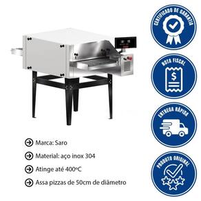 O Forno de Esteira Saro pode assar até 210 pizzas pré-assadas por hora, 90 pizzas com massa crua por hora, ou até 1.600 esfihas com massa crua, permitindo alta produtividade em ambientes de grande demanda.