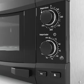 Forno elétrico de bancada com interior Easy Clean, pintura externa em Kromanox com tecnologia No fingerprint, bandeja e grade removíveis, controle de temperatura até 300°C, dourador, timer de 120 min, luz interna, luz piloto, grill, isolamento térmico.Forno autolimpante