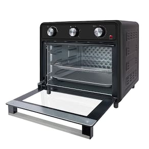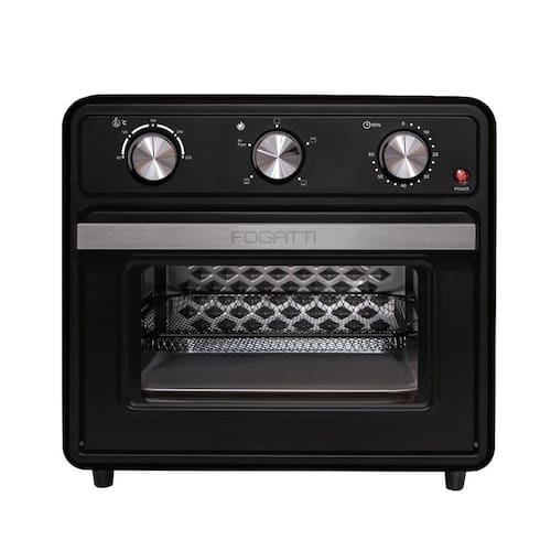 Forno elétrico de bancada com função air fryer, termostato ajustável até 250°C, timer de 60 minutos com desligamento automático, grill, uma prateleira com três níveis de altura e pés antiderrapantes.Forno autolimpante