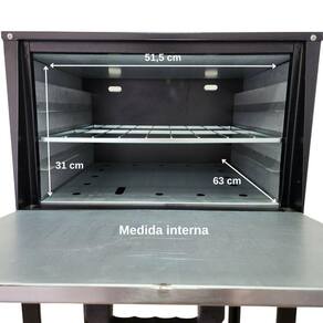 Forno Profissional Grande com Cavalete Baixa Pressão Tampa Inox Marca Cefaz O Forno Profissional Cefaz 100 Litros conta com sistema de gás GLP Baixa Pressão e queimador em serpentina tubular 7/8”, as laterais do forno externo em aço carbono com pintura epóxi na cor preta, sua Tampa Inox com puxadores em baquelite, e seu acabamento interno em chapa minimizada. Para melhor aquecimento seu isolamento é produzido com lã de rocha aplicado nas laterais, e tampa chegando até 250°, assim aumentamos mais sua caloria interna e reduzimos a caloria externa! Contém sistema de botão regulador de gás para o controle da chama. Acompanha 1 Grelha contendo 3 níveis de altura. Ideal para Bolos, massas, pães, carnes, peixes e outros vários tipos de alimentos. Informações Técnicas - Modelo: FRG-15 - Alimentação: Gás GLP Baixa Pressão - Temperatura máxima de até 250 graus - Cor: Preto - Capacidade 100 litros - Forno com Tampa Inox - Acabamento interno em chapa minimizada - Acabamento externo em aço carbono pintado - Isolamento em Lã de Rocha - Cavalete em aço carbono pintado - Acompanha 1 grelha - Consumo de gás 0,395kg/h Medida Interna do Forno Altura: 31cm Largura: 51,5cm Comprimento: 63cm Medida externa do forno montado com Cavalete Altura: 135cm Largura: 63cm COmprimento: 70cm Peso: 30,7kgGarantia3 meses contra defeito de fabricação