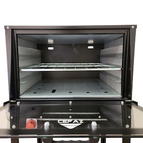 Forno Profissional Grande com Cavalete Baixa Pressão Tampa de Vidro Marca Cefaz O Forno Profissional Cefaz 100 Litros conta com sistema de gás GLP Baixa Pressão e queimador em serpentina tubular 7/8”, as laterais do forno externo em aço carbono com pintura epóxi na cor preta, sua Tampa de Vidro temperado com puxadores em baquelite, e seu acabamento interno em chapa minimizada Para melhor aquecimento seu isolamento é produzido com lã de rocha aplicado nas laterais, chegando até 250°, assim aumentamos mais sua caloria interna e reduzimos a caloria externa! Contém sistema de botão regulador de gás para o controle da chama. Acompanha 1 Grelha contendo 3 níveis de altura. Ideal para Bolos, massas, pães, carnes, peixes e outros vários tipos de alimentos. Informações Técnicas - Modelo: FRG-16 - Alimentação: Gás GLP Baixa Pressão - Temperatura máxima de até 250 graus - Cor: Preto - Capacidade 100 litros - Forno com visor de vidro temperado - Acabamento interno em chapa minimizada - Acabamento externo em aço carbono pintado - Isolamento em Lã de Rocha - Cavalete em aço carbono pintado - Acompanha 1 grelha - Consumo de gás 0,395kg/h Medida Interna do Forno Altura: 31cm Largura: 51,5cm Comprimento: 63cm Medida externa do forno montado com cavalete Altura: 135cm Largura: 63cm Comprimento: 70cm Peso 30,7kgGarantia 3 Meses contra defeito de fabricação