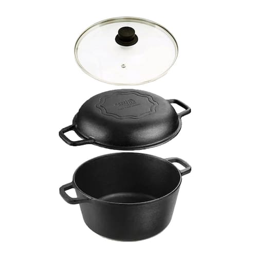Este conjunto tem 02 produtos em um só, na parte de baixo uma caçarola com 25 cm de diâmetro x 9 cm de altura para preparar os mais variados alimentos, sua tampa de ferro é também uma frigideira, também toda de ferro com 25 cm de diâmetro x 4 cm de altura. Além do uso convencional este conjunto pode ser utilizado como assadeira pois pode ir direto ao forno para preparar pães, bolos e etc. Ideal para Arroz, bife, carnes, frango, feijão, caldos e etc. A caçarola é uma panela que apresenta uma grande versatilidade, pois tem o fundo plano e maior área de contato com a fonte de calor, cozinhando os alimentos uniformemente. Com a frigideira prepare carnes suculentas, peixes, ovos, omeletes, panquecas e todos os tipos de alimentos. Todas as panelas de ferro do modelo caçarola podem ser utilizadas em todos os tipos de fogão a gás, a lenha, elétrico e também em cook-top de indução. Acompanha tampa de vidro.