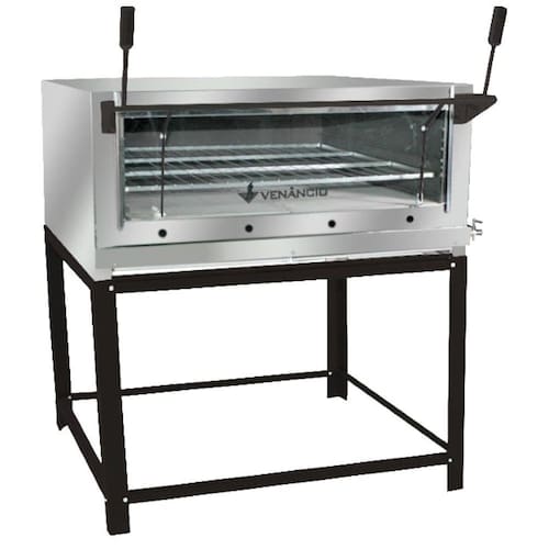 Forno a gás GLP BAIXA PRESSÃO; Laterais, frente e teto externas em aço inox; Sistema para abertura do vidro tipo guilhotina com acabamento em pintura a pó eletrostática com base fosfatizada; Queimadores com sistema de gaveta, em aço tubular, com regulador de entrada de ar para uma chama perfeita; Pedra refratária que armazena o calor obtendo maior uniformidade no assado; Bandeja coletora de resíduos em chapa galvanizada super resistente. Acompanha uma grelha reforçada por câmara; Cavalete reforçado em aço carbono com acabamento em pintura a pó eletrostática com base fosfatizada; Revestimento interno em aço galvanizado; Isolamento em lá de rocha.