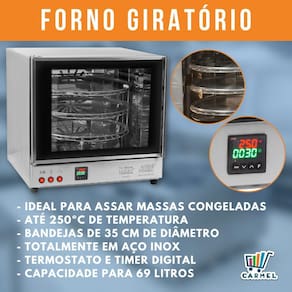 Fácil de usar e ideal para espaços reduzidos, o forno giratório assa todos os tipos de salgados e massas congeladas: croissant, empanadas, tortas, lasanha, pão de queijo chipa, regeneração de salgados fritos congelados, etc.