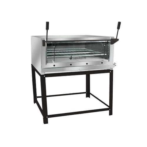 Forno a gás GLP baixa pressão; Laterais, frente e teto externos em aço inoxidável; Sistema para abertura do vidro tipo guilhotina com acabamento em pintura a pó eletrostática com base fosfatizada; Queimadores com sistema de gaveta, em aço tubular, com regulador de entrada de ar para uma chama perfeita; Pedra refratária que armazena o calor obtendo maior; Bandeja coletora de resíduos em chapa galvanizada super resistente; Acompanha uma grelha reforçada por câmara; Cavalete reforçado em aço carbono com acabamento em pintura a pó eletrostática com base fosfatizada; Revestimento interno em aço galvanizado; Câmara com três trilhos de apoio para regulagem de altura das grelhas; Isolamento em lã de rocha; Abertura total do vidro; Termômetro na lateral do forno; Equipamento para uso industrial e profissional.