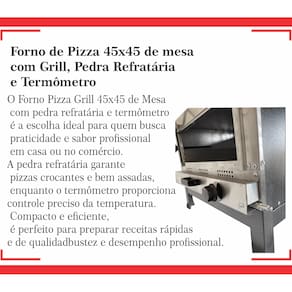 Modelo: 45X45 De MesaFabricante: MR FogõesConteúdo da Embalagem: 1 Forno Pizza Completo; 1 Termômetro;2 Pedras Refratárias2 Contrapeso para Porta.Funcionamento: À Gás GLPRegulador / Válvula: USAR 5kg/h!!! NÃO USAR de 1kg/h ou 2kg/h!!!Acendimento: ManualLuz no Forno: NãoAbertura da Porta: GuilhotinaPedra Refratária: SimMaterial externo: Chapas de Aço com Pintura Epóxi.Material interno: Chapas de Aço Galvanizado.Frente do forno: Chapas de Inox; Vidro Temperado.Isolamento térmico em lã de vidroAltura: 48 cmLargura: 72 cmProfundidade: 62 cmPeso: 21 kgGarantia: 6 Meses Marca: Não Informado