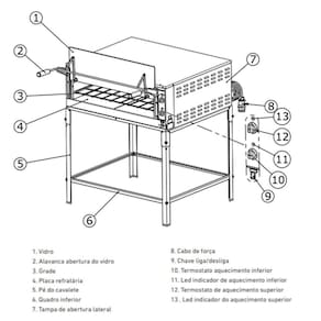 DESCRIÇÃO DO FORNO INDUSTRAL REFRATÁRIO 220V - Com cavalete desmontável, sapatas plásticas, gaveta móvel, placas refratárias, termômetro para controle de temperatura e porta tipo guilhotina; - Aço inox escovado; - Visores de vidro temperado; - Câmara interna com suportes para dois níveis de altura.