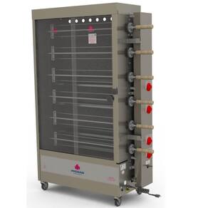 INFORMAÇÕES TÉCNICAS - Estrutura externa em inox escovado 430. - Costa interna esmaltada. - Porta em vidro temperado. - Com gaveta coletora de gordura que facilita o manuseio e a limpeza. - Com rodízios que facilitam o deslocamento. - Controle progressivo de chama máxima e mínima. - Aquecimento a gás através de queimadores tubulares. - Modelo PR 634: 4 queimadores TUBULARES. - Manipulador controlador gás. - Bacia interna em inox. - Baixa pressão. - Entrada de gás na lateral. - Número de Espetos: 6. - Distância entre os espetos: 20 cm. - Espeto tipo garfo. - Capacidade de Frangos: Aproximadamente 30; - Capacidade em Quilos: Aproximadamente 60 Kg; - Equipamentos BIVOLT tensão 127/220v; - Frequência: 50/60 Hz. - Motor monofásico de 1/4cv; - Potência: 360- 275 Watts. - Consumo Médio Elétrico: 0,38 Kw/h. - Consumo de gás: 1,49 Kg/h.