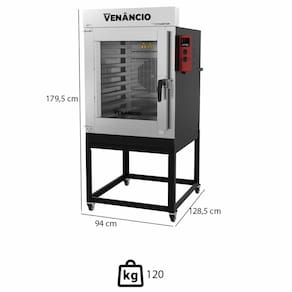 O Forno Industrial Turbo Twister Venâncio FVT8E tem uma temperatura máxima de 230C, ideal para assar diversos tipos de produtos de panificação e confeitaria.