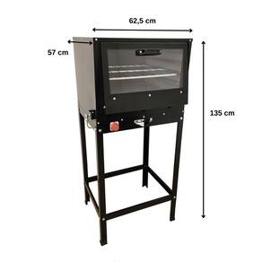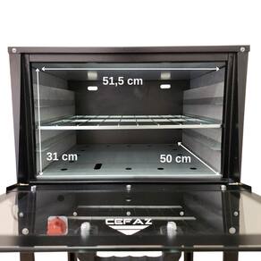 Forno Profissional Médio com Cavalete Baixa Pressão Tampa de Vidro Marca Cefaz O Forno Profissional Cefaz 80 Litros conta com sistema de gás GLP Baixa Pressão e queimador em serpentina tubular 7/8”, as laterais do forno externo em aço carbono com pintura epóxi na cor preta, sua Tampa de Vidro temperado com puxadores em baquelite, e seu acabamento interno em chapa minimizada Para melhor aquecimento seu isolamento é produzido com lã de rocha aplicado nas laterais, e tampa chegando até 250°, assim aumentamos mais sua caloria interna e reduzimos a caloria externa! Contém sistema de botão regulador de gás para o controle da chama. Acompanha 1 Grelha contendo 3 níveis de altura. Ideal para Bolos, massas, pães, carnes, peixes e outros vários tipos de alimentos.Informações Técnicas - Modelo: FRG-08- Alimentação: Gás GLP Baixa Pressão- Temperatura máxima de até 250 graus- Cor: Preto- Capacidade 80 litros - Forno com visor de vidro temperado- Acabamento interno em chapa minimizada- Acabamento externo em aço carbono pintado- Isolamento em Lã de Rocha- Cavalete em aço carbono pintado- Acompanha 1 grelha- Consumo de gás 0,380kg/hMedida Interna do FornoAltura: 31cmLargura: 51,5cmComprimento: 50cm Medida externa do forno montado com cavalete Altura: 135cmLargura: 63cmComprimento: 57cmPeso: 26,3kg Garantia 3 meses contra defeito de fabricação