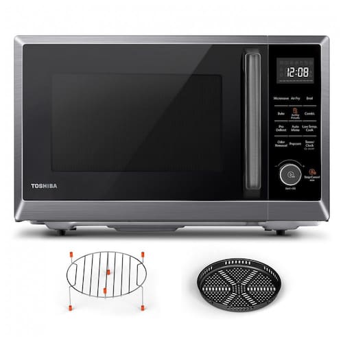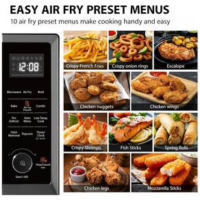 Forno micro-ondas 8 em 1 com funções de micro-ondas, air fryer, assar, grelhar, combi, baixa temperatura, remoção de odores e descongelamento. Potência de saída de micro-ondas de 1000 watts e potência de entrada de 1600 watts. Prateleira giratória removível de 31,5 cm. Pipoca com um toque, botões de fácil manuseio, prateleira giratória com memória de posição, cozimento rápido, cozimento em vários estágios, relógio, timer de cozinha e função muda. Design em aço inoxidável preto.Função Grill