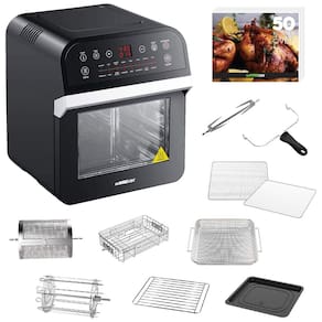 Acessórios Incluídos: Pinça para rotisserie, espeto rotativo, prateleira para forno, bandeja de gotejamento, espeto para kebab, gaiola para rotisserie, gaiola para grelhar bifes, cesto raso de malha e duas bandejas de malha.