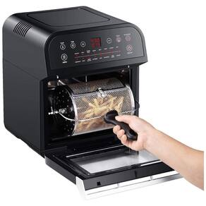 Esta fritadeira acompanha 10 acessórios essenciais para facilitar suas criações culinárias. São eles: pinça para rotisserie, espeto rotativo, prateleira para forno, bandeja de gotejamento, espeto para kebab, gaiola para rotisserie, gaiola para grelhar bifes, cesto raso de malha e duas bandejas de malha.