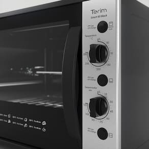 Forno elétrico de bancada com espeto giratório, 60 litros de capacidade, timer de 120 minutos, controle de temperatura até 300 graus, dourador, interior esmaltado Easy Clean, bandeja e grade removíveis, luz piloto, grill, isolamento térmico, pés antiderrapantes e pegador para espeto.Forno autolimpante