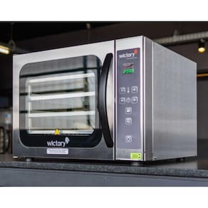 - Modelo: WCV-435; - Dimensões externas (AxLxP): 440 x 590 x 650 mm; - Assadeiras: 150x350x350 mm; - Capacidade produtiva por assadeira (baseada em pães de 50g): 9 pães; - Peso de alimentos indicado por assadeira: 450 g; - Distância entre assadeiras: 7 cm; - Fase: Mono; - Consumo Médio Energia: 0,51 kWh; - Potência instalada: 3 kW; - Conexões de entrada de água (BSP): 3/4" - Frequência: 60 Hz; - Cordão de alimentação: Tipo Y; - Classe: I; - Grau de proteção (IP): IP14; - Peso do Forno com Assadeiras: 24 kg; - Tensão: 220V.