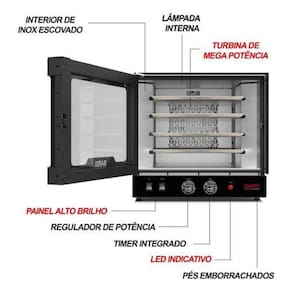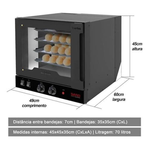 Forno turbo elétrico de 4 esteiras: Este forno é a revolução dos fornos industriais, sem fumaça, sem sujeira e com um sabor ainda melhor. Com acendimento automático, neste forno você apenas precisa apertar um botão e pronto, o aquecimento já está acesso. Achou pouco Este forno assa o seu alimento ainda mais rápido do que o normal, elimina a chance de queimá-lo e permite ter o mesmo padrão sempre. Não emite fumaça: Ao não emitir fumaça este forno se torna ideal para cozinhas pequenas ou ambientes com pouca ventilação. Instale o seu forno onde quiser, sem se preocupar com sistema de exaustão ou ventilação. Baixo consumo: Este forno é um dos únicos do mercado com resistência blindada de mega potência, que além de ser mais potentes também é muito mais econômica. Muito mais potência: Este forno possui o turbo mais potente da categoria, com 2.500w de potência permite assar seu alimento muito mais rápido e com um sabor inigualável. Características: - consumo: 1,2 kw/h - potência da resistência: 2.500w - potência do motor: 1/30cv - medidas externas: 49x60x45cm cxlxa - medidas internas: 46x44x33cm cxlxa - temperatura máxima: 250ºc - acompanha 4 esteiras de 35x35cm - possui iluminação interna de 35w - possui timer de até 120 minutos - possui controle de temperatura 50-250ºc - possui paredes com isolamento térmico Garantia e suporte: Todos os produtos da saro possuem garantia total contra defeitos de fábrica. Somos os únicos que possuímos uma rede com mais de 100 assistências técnicas espalhadas pelo brasil.
