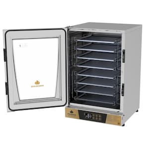 Características Técnicas: Estrutura em aço inox escovado Pés de borracha com regulagem de altura Porta com visor de vidro temperado Puxador de polímero isolante resistente a altas temperaturas Duplo travamento da porta Acompanha 8 esteiras de 35 x 35 cm Iluminação interna Aquecimento elétrico através de resistência blindada Controle digital multifuncional de fácil programação 10 receitas programáveis Função vapor Rack aramado com guia antiqueda Litragem: 77L útil | 106L total Temperatura máxima de 250C Hélice de duplo sentido de giro que garante uniformidade e sabor autêntico em todas as suas preparações