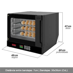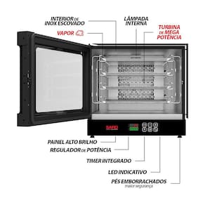 Possui capacidade para 70 litros e acompanha 4 esteiras removíveis para que você possa colocá-las e retirá-las de acordo com a necessidade da sua receita. Além disso, este forno turbo digital elétrico também conta com iluminação interna de 35W, timer de até 120 minutos para controle dos alimentos que serão assados, controle de temperatura através do termostato regulável que vai de 50C a 250C e paredes com isolamento térmico para que o ambiente não fique super aquecido durante o uso do equipamento.