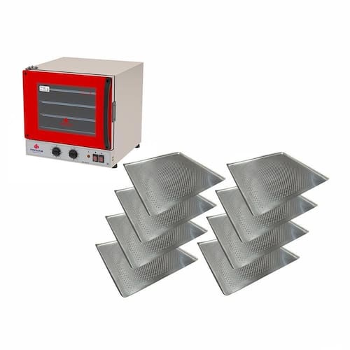 Especificações:- Com iluminação interna, turbina que distribui o calor uniformemente e timer;- Este forno é fabricado em aço inoxidável escovado;- Isolamento térmico com lã basáltica;- Puxador em polímero isolante de alta resistência;- Porta em vidro temperado 4mm;- Controlador de temperatura (termostato) com regulagem de 50C a 250C;- Controlador de tempo de cozimento (timer) com 120 minutos.- Aviso sonoro de tempo de cozimento;- Painel com teclas individuais para acionamento do motor (turbina) e lâmpada;- Litragem: 39 litros úteis e 56 litros totais;- Resistência 2080W;- Acompanha 4 assadeiras perfuradas 35x35cm.- Motor monofásico de 1/30CV;- Resistência blindada de 2080W;- Iluminação interna Lâmpada halógena de 35 W;- LED indicador de temperatura;- Tensão 220V;- Amperagem: 16 A;- Frequência: 50 - 60 Hz;- Medidas totais: 51cm A x 51,8cm L x 66,5cm P;- Medidas internas: 33 cm A x 46cm L x 43 cm P;- Distancia/altura entre as formas: 7cm;- Medidas da embalagem: 57cm A x 71cm L x 55cm P;- Peso Líquido: 21,5kg;- Peso Bruto: 27,1kg. Alimentação: Elétrica | Cor: Vermelho | Tipo de montagem: de Bancada | Capacidade: 65 L | Selecione: Forno Turbo | Produto: Forno Turbo | Função do forno: Turbo | Tipo de Forno: de Bancada | Voltagem: 220V