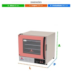 - Qual a capacidade interna do forno?As dimensões internas do forno são de 33 cm de altura, 46 cm de largura e 43 cm de profundidade. O espaço entre as bandejas é de 7 cm, o que é ideal para pães, bolos e salgados. Alimentação: Elétrica | Cor: Rosa | Tipo de montagem: de Bancada | Capacidade: 65 L | Produto: Forno | Função do forno: Turbo | Tipo de Forno: de Bancada | Voltagem: 110V