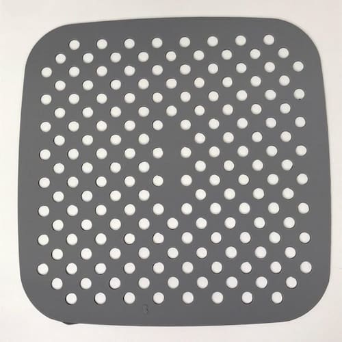 Características Gerais do produto Tapete quadrado de silicone protetor para Air Fryer 20centímetros, antiaderente, reutilizável, cometros sulcos para circulação de ar, suporta altas temetrosperaturas, leve (74g).