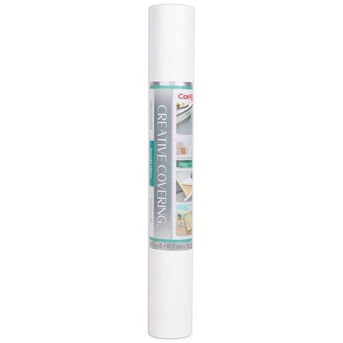 Forro adhesivo creativo de la marca Con-Tact, color blanco, de 46 cm x 1524 cm (18" x 50 pies). - FORRO AUTOADHESIVO MULTIUSOS: ¡Embellece, protege o personaliza cualquier superficie! Los forros adhesivos creativos de la marca Con-Tact son los más versátiles para estantes en el mercado. Su respaldo autoadhesivo se adhiere a cualquier superficie lisa, ideal para cubrir estantes, gabinetes, armarios, paredes, cajones y proyectos artísticos. Desde proyectos de bricolaje hasta la protección de muebles, o de proyectos escolares hasta renovaciones completas, los forros Con-Tact te cubren. - DISEÑADO PARA TI: Con más de 40 años diseñando y fabricando forros adhesivos para estantes y papel contact, la marca Con-Tact garantiza calidad y diseño actual. Fabricado en EE.UU. con diseñadores enfocados en tendencias, es un producto confiable para cualquier proyecto, ya sea para proteger superficies, darle color a un espacio, personalizar casilleros o proteger estantes. - FÁCIL DE APLICAR: Método sencillo de despegar y pegar; solo retira el papel protector y adhiérelo a una superficie limpia y plana. El adhesivo innovador permite reposicionar el forro para corregir errores durante la instalación. Se retira sin dejar residuos. Cuenta con un reverso cuadriculado que facilita cortar con tijeras domésticas a la medida deseada. - DURADERO, IMPERMEABLE Y FÁCIL DE LIMPIAR: Calidad premium hecha en EE.UU. que asegura durabilidad a largo plazo. El vinilo es impermeable, apto para usar en casa, oficina o garaje. Su característica impermeable permite limpiar fácilmente con una esponja húmeda para eliminar marcas o manchas. - APLICACIÓN: Limpia la superficie lisa con agua y jabón, enjuaga y seca bien antes de aplicar. Despega el respaldo gradualmente comenzando por una esquina y aplica cuidadosamente, especialmente en áreas grandes, para facilitar la colocación.