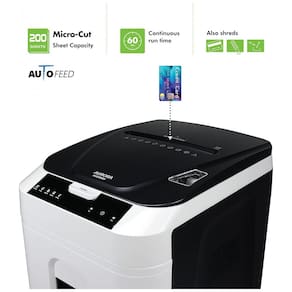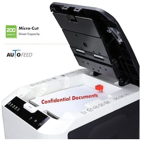 Recursos de trituração automática para eficiência ideal, trituração automática máxima de 200 folhas e capacidade de trituração manual de 10 folhas. Tensão: 120 volts 54,43 kgf, cm. Frequência: 60 Hz. O microcorte transforma o papel em pequenos pedaços semelhantes a confetes medindo 2 por atende aos padrões P 5 de alto nível de segurança tritura 10 vezes menor que os trituradores de corte transversal padrão. Aproximadamente 2.592 partículas por papel tamanho carta. Tempo de execução contínua ininterrupta de 60 minutos Anti encravamento Retrocesso automático para eliminar encravamentos de papel. Operação ultrassilenciosa. Auto Power Sleep para economia de energia e segurança. Lixeira removível de 32,18 litros com luzes indicadoras de LED Status de espera, superaquecimento, compartimento cheio, sobrecarga, porta aberta.