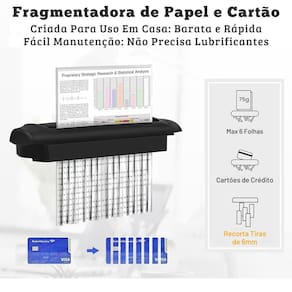 Corte em tiras de 6mm segurança no descarte ; Tritura até 6 folhas por vez; Fragmenta papel, cartões e grampos metálicos; Não fragmenta CDs ou clips metálicos; Adaptável em lixeiras de 28cm a 47cm de largura; Dimensões: 32 x 12 x 8cm; Peso: 1,3kg.