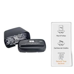 Corte em tiras de 6mm segurança no descarte ; Tritura até 6 folhas por vez; Lixeira de descarte de 9 litros; Fragmenta papel, cartões e grampos metálicos; Não fragmenta CDs ou clips metálicos; Dimensões: 33 x 29 x 15cm; Peso: 1,5kg.