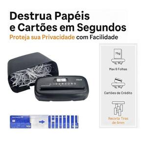 Corte em tiras de 6mm segurança no descarte ; Tritura até 6 folhas por vez; Lixeira de descarte de 9 litros; Fragmenta papel, cartões e grampos metálicos; Não fragmenta CDs ou clips metálicos; Dimensões: 33 x 29 x 15cm; Peso: 1,5kg.