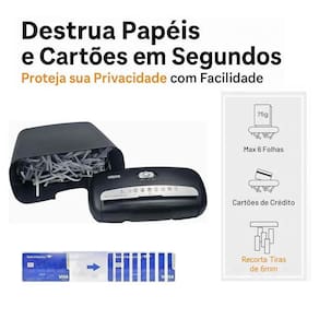 Corte em tiras de 6mm segurança no descarte ; Tritura até 6 folhas por vez; Lixeira de descarte de 9 litros; Fragmenta papel, cartões e grampos metálicos; Não fragmenta CDs ou clips metálicos; Dimensões: 33 x 29 x 15cm; Peso: 1,5kg.