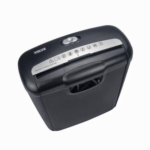 Corte em tiras de 6mm segurança no descarte ; Tritura até 6 folhas por vez; Lixeira de descarte de 9 litros; Fragmenta papel, cartões e grampos metálicos; Não fragmenta CDs ou clips metálicos; Dimensões: 33 x 29 x 15cm; Peso: 1,5kg.