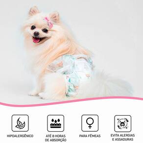 Fralda Descartável para Cães Fêmeas Tamanho M com 12 unidades Dog's Care A Fralda Higiênica Dog's Care possui Liberdade e Praticidade, dentro e fora de casa, para nossos Pets e para nós. São extremamente confortáveis e anatômicas, resolvem o problema de urina fora do lugar, ou fora de hora, em viagens, passeios no parque, no carro e em locais fechados. Indicado para o xixi, possuem costura anti-vazamento, orifício anatômico para o rabo, para as fezes, elástico de ponta a ponta, manta super absorvente com gel em flocos que garantem de 6 a 8 horas de absorção do xixi e fitas de “fecho aderente” para proporcionar um melhor ajuste para a fêmea. FECHO EM fecho aderente AJUSTÁVEL: Feitas exclusivamente para cães fêmeas, as fraldas descartáveis Dog’s Care possuem fecho em fitas de fecho aderente reposicionáveis que não grudam nos pelos, oferecem fácil colocação e ajuste na cintura. Ideais para passeios e viagens, trazem tranquilidade para você e liberdade para a sua amiguinha de quatro patas. CONFORTO ANATÔMICO: Desenvolvida exclusivamente para xixi, com orifício para a cauda e saída das fezes, possui formato anatômico que deixa livre o movimento das patinhas, as fraldas são indicadas para cachorrinhas de todas as idades, que estejam nos períodos de cio ou pós-cirúrgico, que sofram de incontinência urinária ou demarcação de território, proporcionando um ajuste perfeito e uso prolongado (+ de 8 h) sem assaduras e desconforto. ABSORÇÃO EFICIENTE: Fabricadas com exclusiva tecnologia BLOCK GEL e barreiras anti vazamento, as fraldas possuem tecnologia de rápida absorção que dura mais de 8 horas, promovem proteção contra o vazamento de xixi fora de hora e lugar. HIPOALERGÊNICA: Produzidas com os mesmos cuidados das fraldas de bebê, as fraldas Dog’s Care são esterilizadas para máxima higiene e segurança durante o uso, evitando irritações e sendo uma ótima opção para pets com pele sensível.
