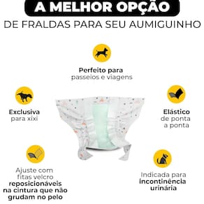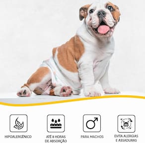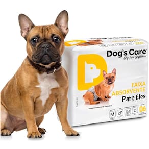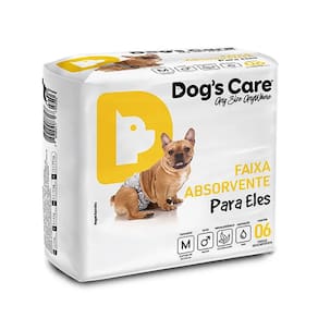 Fralda Descartável para Cães Machos Tamanho M com 06 unidades Dog's Care \nA Fralda Dog's Care para Cães Machos possui formato anatômico de faixa absorvente, manta super absorvente com gel em flocos que garantem de 6 a 8 horas de absorção (depende do fluxo de urina) e fitas reposicionáveis para proporcionar melhor ajuste; Esterilizada para evitar proliferação de fungos e bactérias evitando assaduras e alergias, proporciona mais conforto, não incomoda o escroto e as patas do animal; Exclusiva para xixi, indicada para donos que não abrem mão da companhia do amigo pet e sofrem com a demarcação de território, evitando, assim, o estrago de móveis e utensílios dentro de casa e maiores constrangimentos em passeios e viagens, ou quando o pet já está velhinho e sofre com a incontinência urinária. O produto é indicado também para os cães no pós operatório e que não fazem xixi no lugar certo. \nQuando as fraldas nos salvam?\nEm casos de demarcação de território Quando ela estiver no cio Quando ele insiste em fazer xixi fora do lugar Na visita na casa da vovó, da dinda para ele não fazer xixi por todo canto Casos de incontinência urinária Quando ele já estiver bem velhinho Depois de algum procedimento cirúrgico Para um passeio tranquilo e sem sujeiras! DIFERENCIAIS: Elástico de ponta a ponta; Fitas fecho aderente para melhor ajuste na cintura e não grudar no pelo; Esterilizada para evitar a proliferação de fungos e bactérias evitando assaduras e alergias.