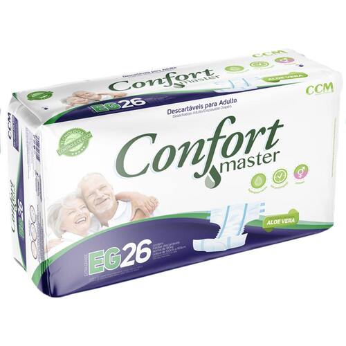 Fraldas Descartáveis Geriátricas Confort Master. Indicada para incontinência, pós-opertório e pós-parto. Com gel absorvente, permite uso prolongado. Barreiras antivazamento, indicador de umidade, fitas ajustáveis e formato anatômico, que proporciona mais conforto e segurança com discrição. Testada dermatologicamente e hipoalergênica. Peso: acima de 90Kg Cintura: de 120 cm à 165 cm