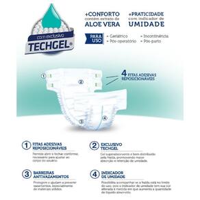 Mas também é indicada para situações de pós-operatório e pós-parto. Barreiras anti-vazamentos e quatro fitas adesivas reposicionáveis permitem abrir e fechar conforme necessário, para ajuste perfeito ao corpo do usuário.