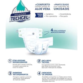 * Mas também é indicada para situações de pós-operatório e pós-parto.Barreiras anti-vazamentos e quatro fitas adesivas reposicionáveis permitem abrir e fechar conforme necessário, para ajuste perfeito ao corpo do usuário.