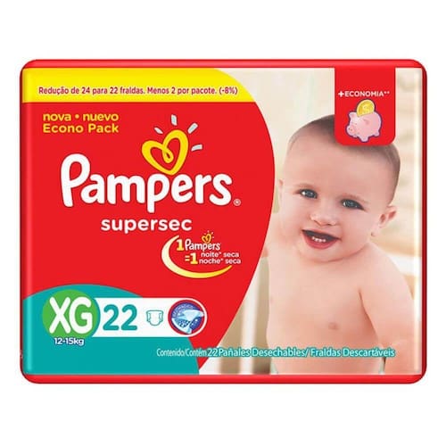 Descrição: a fralda descartável pampers supersec conta com sistema de absorção de 4 camadas com gel superabsorvente que evita que o xixi entre em contato com a pele do seu bebê. A cobertura suave como tecido oferece mais conforto ao seu bebê para uma maior comodidade. Ação/ativos: a cobertura suave como tecido oferece mais conforto ao seu bebê para uma maior comodidade. As barreiras duplas anti vazamento ajustam-se suavemente entre as pernas do seu bebê, ajudando a evitar que a fralda vaze. As fitas reajustáveis permitem verificar quantas vezes você quiser sem danificar a fralda, melhorando o ajuste. O dermacrem, exclusiva loção, dá maior proteção a seu bebê. Seu bebê bem cuidado Modo de usar: remova a fralda usada e limpe entre as dobras da pele do bebê com toalhinhas umedecidas suaves, como a pampers sensitive wipes. Lembre-se de limpar sempre da frente para trás. Levante o bebê cuidadosamente pelos tornozelos e deslize uma fralda limpa por baixo. As marcações coloridas devem estar na frente, viradas para você. Feche a fralda e ajuste as abas elásticas de modo que não fiquem muito apertadas ou muito soltas, você deve ser capaz de pôr dois dedos confortavelmente entre a fralda e a barriguinha do bebê. Este anúncio contém: 01 pampers supersec pacotão fralda infantil xg c/22