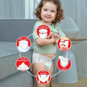 Cintura elástica 360 que se adapta ao corpinho do seu bebê para um ajuste perfeito. Conforto e ajuste superiores para uma pele protegida**vs Pampers premium care Fácil de vestir e tirar, rasgue suas laterais e retire-a normalmente Loção hipoalergênica que ajuda a prevenir assaduras Coberta respirável para maior cuidado com a pele do seu bebê Até 12 horas* de proteção para noites inteiras de sono sequinho*Pode variar de acordo com os hábitos e características do bebê