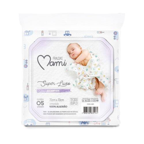 Fralda Super luxo Mascolina 70x70 Kit 5 Fraldas Super Luxo menino Linha Mami - Papi Baby Fralda é um item essencial para o enxoval, utilizada em vários momentos do dia a dia do bebê. Este modelo da Papi é feito em tecido duplo, tecido mais encorpado e macio, em tecido 100 algodão. Linha de produtos da marca Papi baby, que destaca sua linha de produtos Mami a Super Fralda Luxo, tecido Duplo. É absorvente, possui alta capacidade de reter líquido, deixando o bebê sequinho por mais tempo. É usada também para forrar superfícies em passeios, para cobrir o bebê conforto e/ou carrinho na hora da soneca em passeios. Informações do Produto Kit com 5 fraldas Medida 70 x 70 cm Composição: 100% Algodão