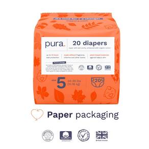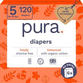 Pura Fraldas ecológicas tamanho 5 (11-16 kg) totalmente livre de cloro (TCF), hipoalergênicas, algodão orgânico macio, sustentável, proteção contra vazamento de até 12 horas, Allergy UK, 6 pacotes de - Bom para bebês: Totalmente livre de cloro (TCF). Supermacias e confortáveis, nossas fraldas são aprimoradas com algodão orgânico, perfeitas para a pele delicada do recém-nascido. Com apenas materiais à base de plantas contra a parte inferior do seu bebê, nossas fraldas dermatologicamente testadas e certificadas para alergias são feitas sem fragrância, branqueamento de cloro, loção, parabenos, látex de borracha natural e ftalatos. - Sem vazamentos: mantendo seu pequeno confortável e seco, nossas fraldas oferecem até 12 horas de proteção contra vazamentos e apresentam uma camada à prova d'água à base de plantas com microporos para permitir que a pele do seu bebê respire. - Bom para o planeta: as fraldas da Pura são fabricadas em uma planta neutra em carbono, alimentada por eletricidade verde. Sempre que possível, substituímos materiais não sustentáveis por materiais de menor impacto, como polpa de madeira de florestas gerenciadas de forma sustentável no núcleo absorvente de nossas fraldas. Nossa embalagem é feita de papel, por isso é mais fácil de reciclar! - Confiável pelos pais: feitas na UE com os mais altos padrões, as fraldas Pura ganharam vários prêmios, votados por pais reais. - UTILIZANDO OS NEGÓCIOS PARA O BEM: A Pura é uma empresa B-Corp certificada e uma empresa de carbono neutro.