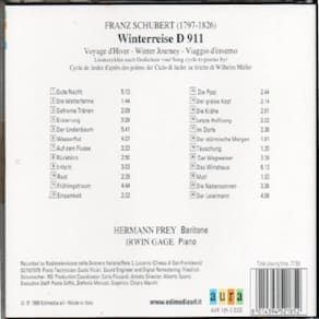1. Gute Nacht 2. Die Wetterfahne 3. Gefrorne Trnen 4. Erstarrung 5. Der Lindenbaum 6. Wasserflut 7. Auf dem Flusse 8. Rckblick 9. Irrlicht 10. Rast 11. Frhlingstraum 12. Einsamkeit 13. Die Post 14. Der Greise Kopf 15. Die Krhe 16. Letzte Hoffnung 17. Im Dorfe 18. Der strmische Morgen 19. Tuschung 20. Der Wegweiser 21. Das Wirtshaus 22. Mut 23. Die Nebensonnen 24. Der Leiermann