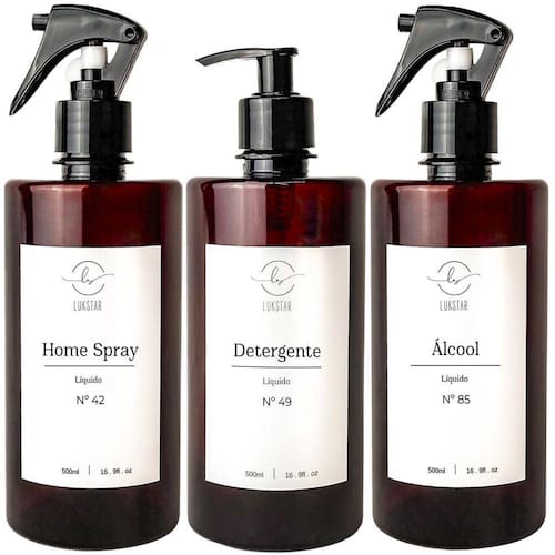 Frasco Ambar Organizador Minimalista Decorativo Refil Pump Se você está procurando por uma forma de tornar a sua casa mais organizada e sofisticada, então não procure mais O Frasco Âmbar de Plástico 500ml é o produto perfeito para você. Com um design moderno, limpo e minimalista, este conjunto de três frascos de plástico na cor Âmbar irá transformar completamente o visual do seu banheiro. Além disso, a tampa de válvula pump na cor preta é super elegante e acrescenta um toque de sofisticação. E não se preocupe com a identificação dos produtos, pois os rótulos impermeáveis e resistentes à água tornam fácil a identificação dos produtos que você colocou dentro dos frascos. Não perca mais tempo com embalagens inadequadas e desorganização, adquira agora mesmo o Frasco Âmbar de Plástico 500ml. Lembrando - Os rótulos são impermeáveis e resistentes à água. Rótulos disponíveis: - Detergente- Home Spray- Alcool Contém no Kit: - 1 Frasco de Plástico Âmbar Detergente 500ml com válvula pump. - 1 Frasco de Plástico Âmbar Home Spray 500ml com válvula Spray. - 1 Frasco de Plástico Âmbar Alcool 500ml com válvula Spray. OBS: Os frascos NÃO acompanham o líquido Medidas:- Altura: 19cm- Largura: 7cm Marca: Lukstar