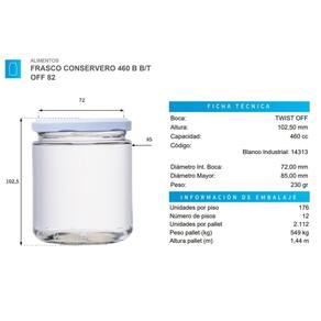 DESCRIÇÃO DO PRODUTO: Alto: 102,5 mmCapacidade: 460ccDiâmetro interior boca: 72 mmDiâmetro maior: 85 mmPeso: 230 grBoca: Twist off 82 mmUnidades por pacote: 25Cor da tapa: BlancoFrascos conservveros de vidrio 460cc, vienen en pack de 25 unidades en bandejas selladas con tapa incluida.Cores de tapas disponíveis: Blancas, negrasFrascos ideais para armazenar conservas, alimentos de todo tipo.